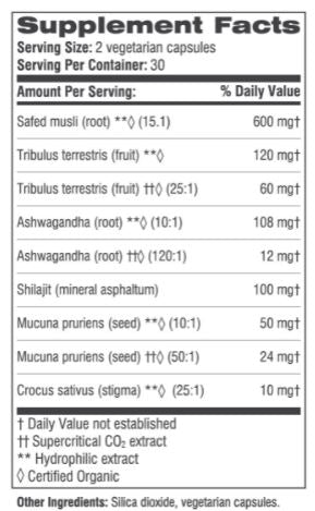 Safed musali extract, ashwagandha extract, tribulus terrestris extract, shilajit, mucuna pruriens extract, crocus sativus raw herb powder, silica dioxide, and vegetarian capsules.