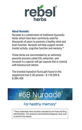 Nuroade is combination of traditional Ayurvedic herbs which have been commonly used for thousands of years to promote a healthy mind and brain function. Nuroade will help support normal mental activity, cognitive function and memory.* These herbs are concentrated by an extremely powerful process called CO2 extraction. The branded ingredient NuroLight found in this supplement has 2 US patents - 8,110,229 & 8,394,429