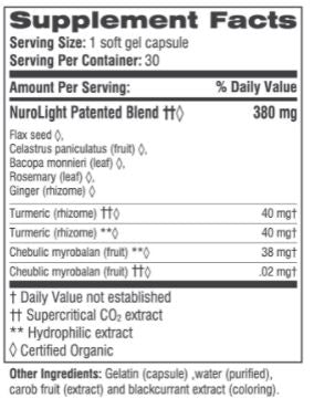 Gelatin (capsule) ,water (purified), carob fruit (extract), blackcurrant extract (coloring), flax seed extract, celastrus paniculatus (fruit) extract, bacopa monnieri (leaf) extract, rosemary (leaf) extract, ginger (rhizome) extract, turmeric (rhizome) extract and chembulic myrobala (fruit) extract..