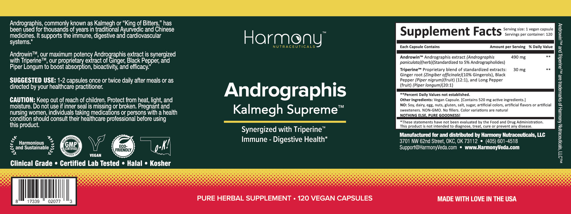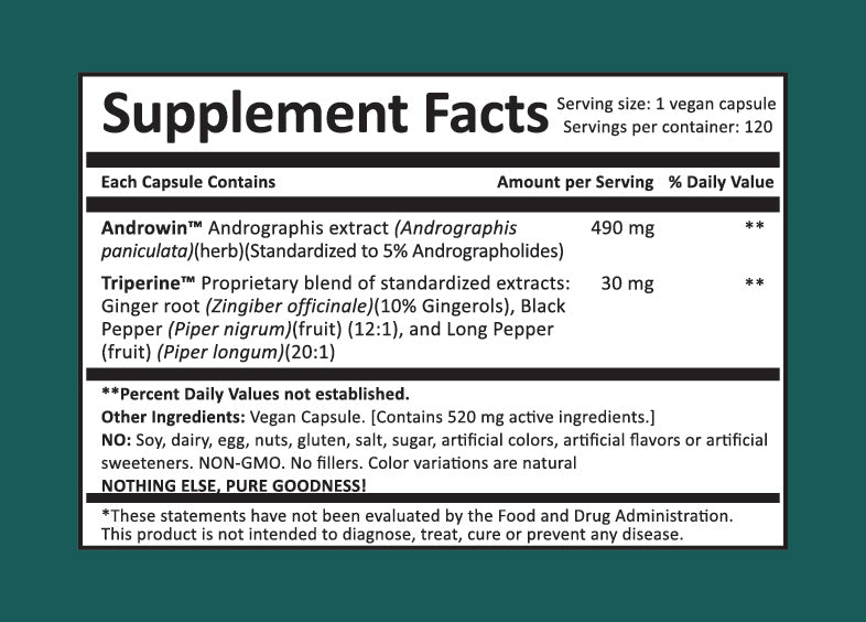 | Andrographis, commonly known as Kalmegh or King of Bitters has been used for thousands of years in traditional Ayurvedic and Chinese medicine. It supports the immune, digestive and cardiovascular systems.* Androwin, our maximum potency Andrographis extract is synergized with Triperine, our proprietary extract of Ginger, Black Pepper, and Piper Longum to boost absorption, bioactivity, and efficacy.* Classifications/Certifications: GMP Certified, Certified Lab Tested, Halal, Kosher, Vegan, Clinical Grade |