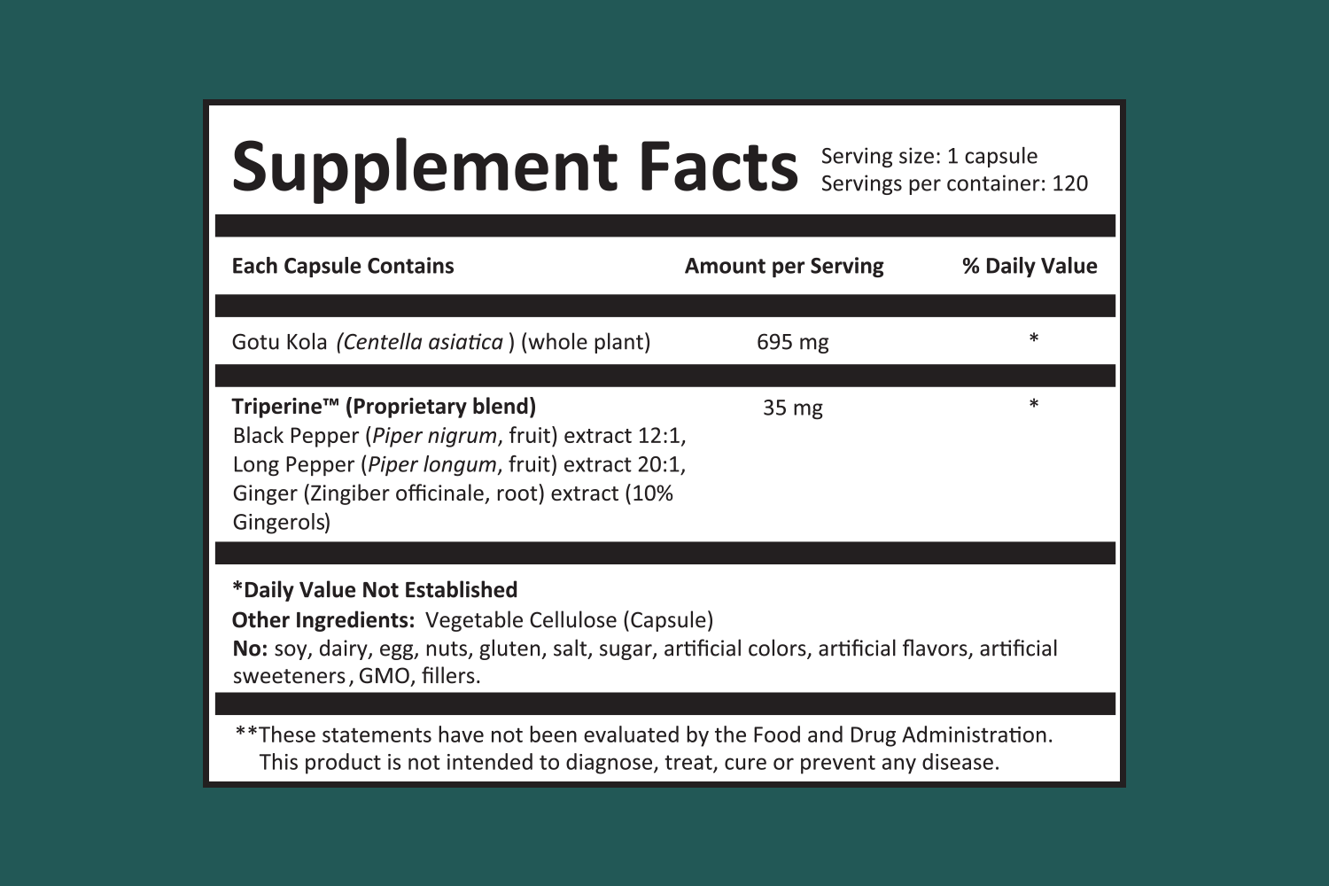 | Used for thousands of years in Ayurvedic, Chinese and African medicines. Renowned as mind, brain and nervine tonic. Supports longevity, vitality, memory, intelligence and concentration. Boosts energy without caffeine or other stimulants.* Promotes healthy skin, hair and vascular system. Mindowin, our proprietary Gotukola extract is fortified with abundant Triperine, a synergistic blend of black pepper, ginger and piper longum extracts for enhanced absorption and bioactivity.* Classifications\Certifications : GMP Certified, Certified Lab Tested, Halal, Kosher, Vegan, Clinical Grade |
