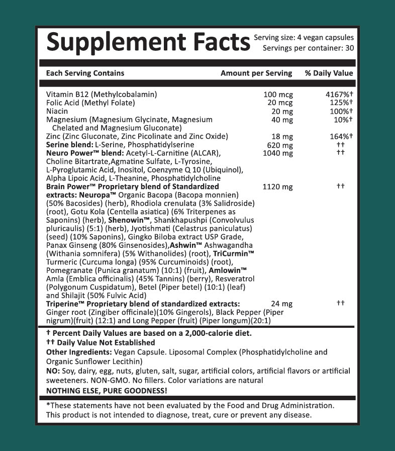 | Neuro Power supports optimum functioning of the brain, mind, and nervous system. This powerful synergistic formula of Dr. Gumman & team integrates the best of Modern Science, Traditional Ayurvedic, and Chinese Medicines.* Neuro Power is synergized with Triperine, our proprietary extract of Ginger, Black Pepper, and Piper Longum to boost absorption, bioactivity, and efficacy. Liposomal delivery enhances cellular uptake and bioavailability.* Classifications/Certifications: GMP Certified, Certified Lab Tested, Halal, Kosher, Vegan, Clinical Grade |